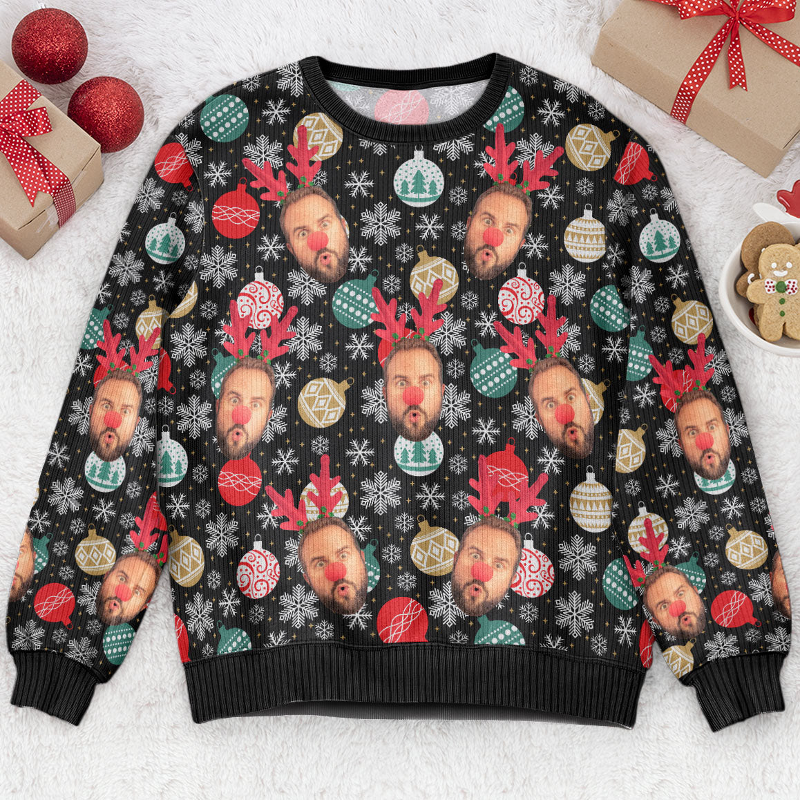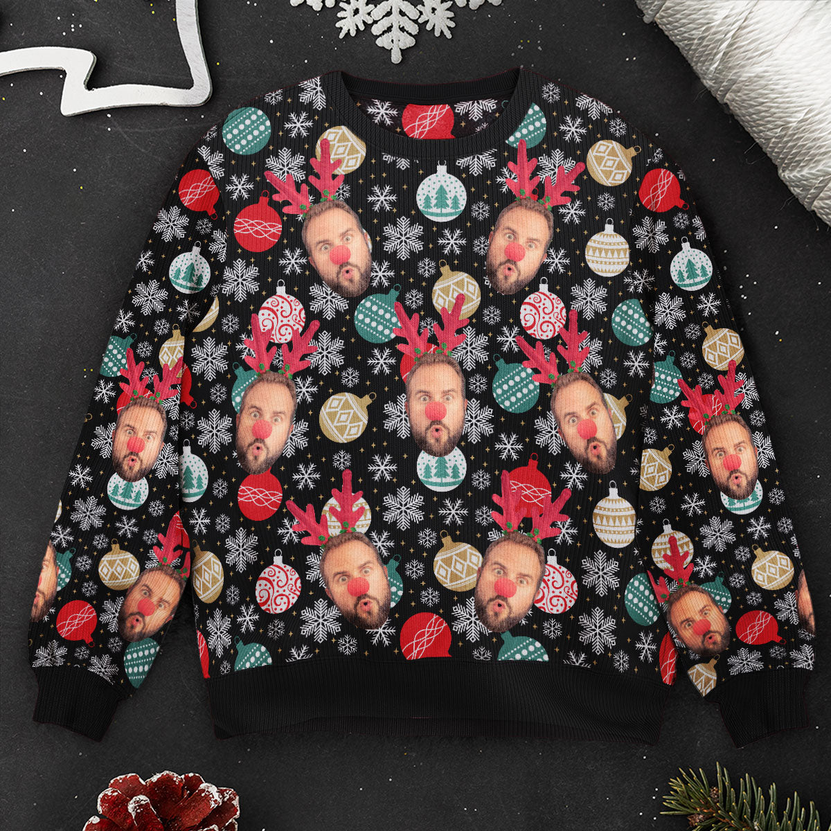 Face Christmas Family Baubles Balls And Snowflakes – Personalized Photo Ugly Sweater