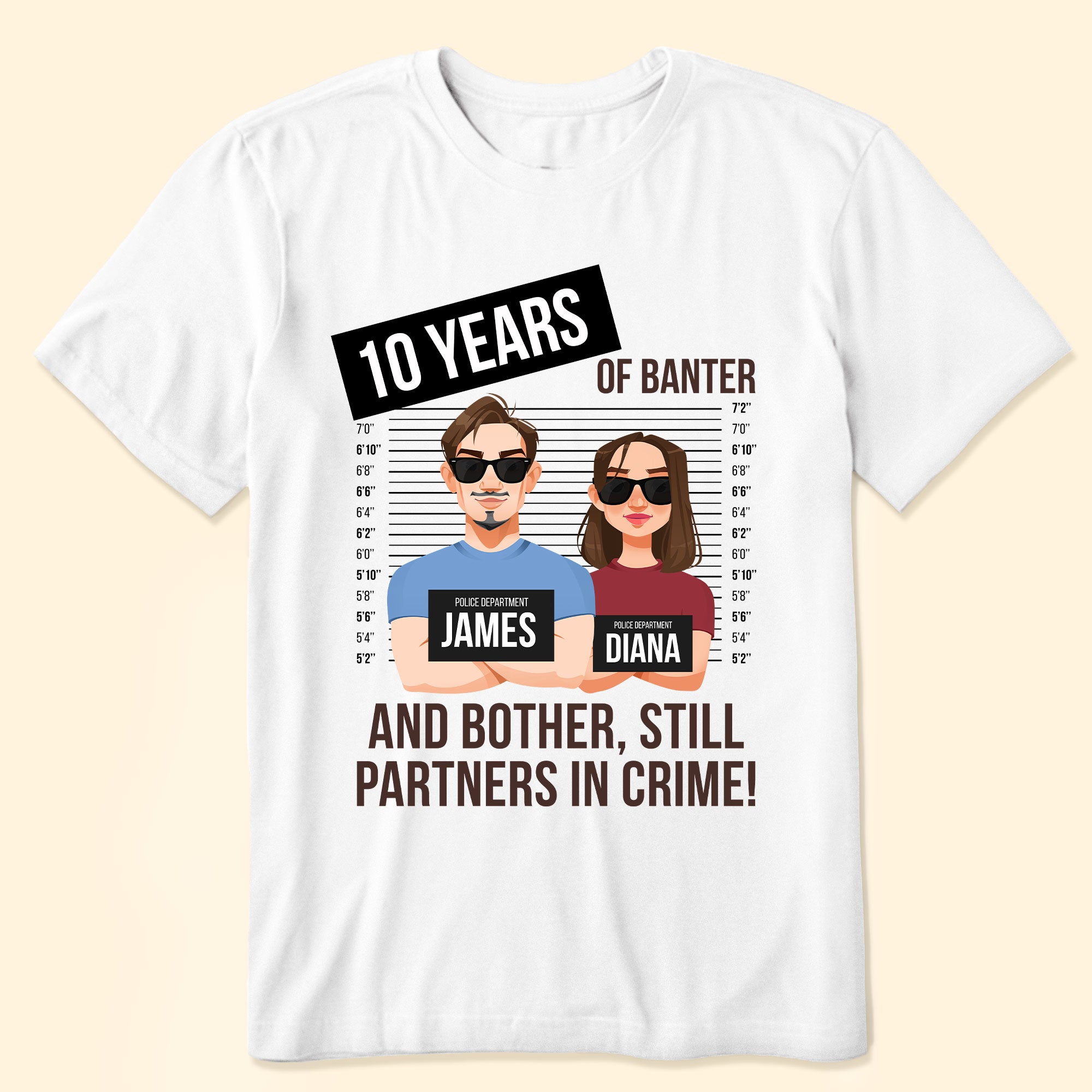 Celebrate your love with a dash of humor and romance with our Personalized Couple Matching Shirts! Perfect for any couple who’s enjoyed “…. years of banter and bother and still partners in crime!” Customize the number of years and add custom characters of you and your partner to make these shirts uniquely yours.